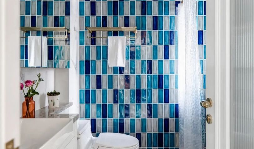 衛生間以藍白配的小墻磚,結合灰色的地面磚搭配,還有浴簾作為干濕分離的設計,裝上金色的五金件與柜門拉手,讓空間顯得格外的華麗精致。