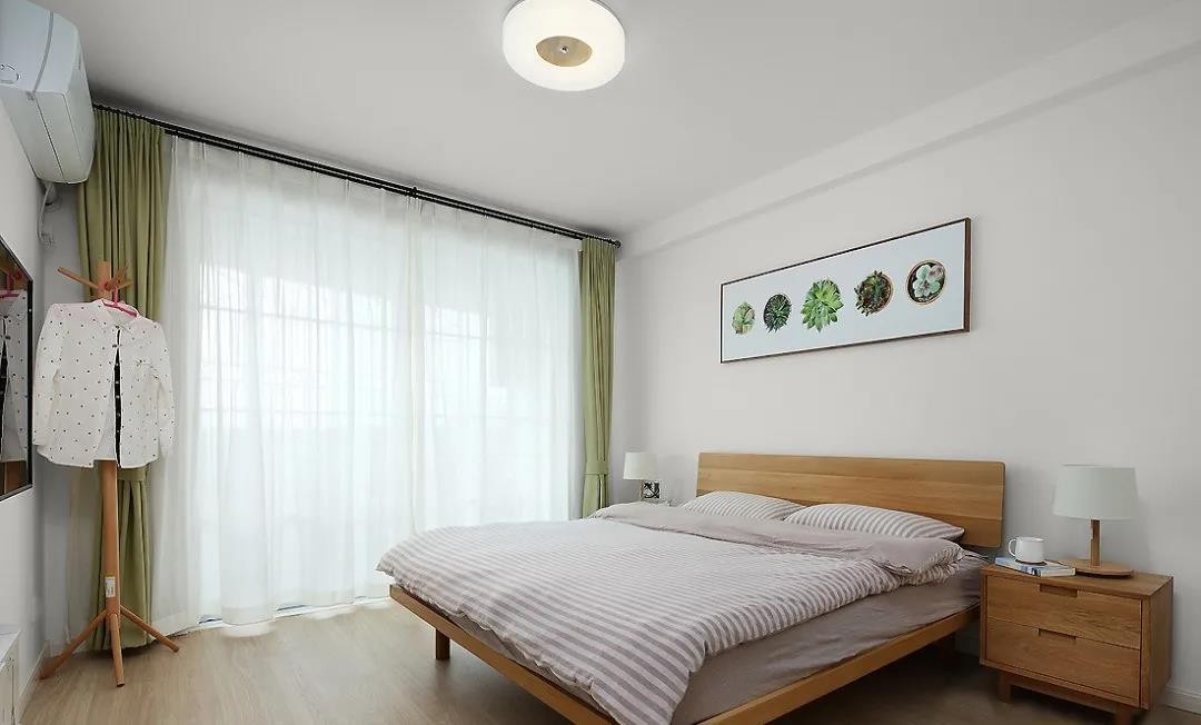 主臥采用大面積的原木色,床、床邊柜,條紋的床單與自然清新的掛畫綠植相結合。