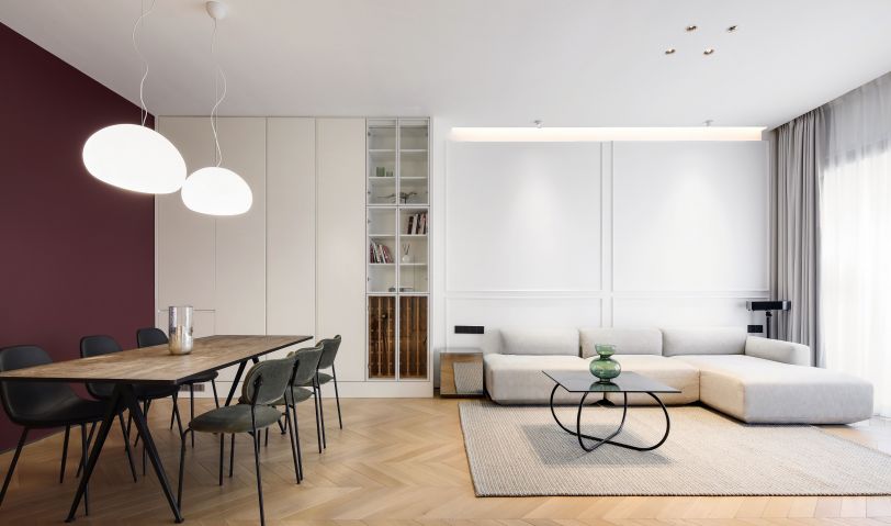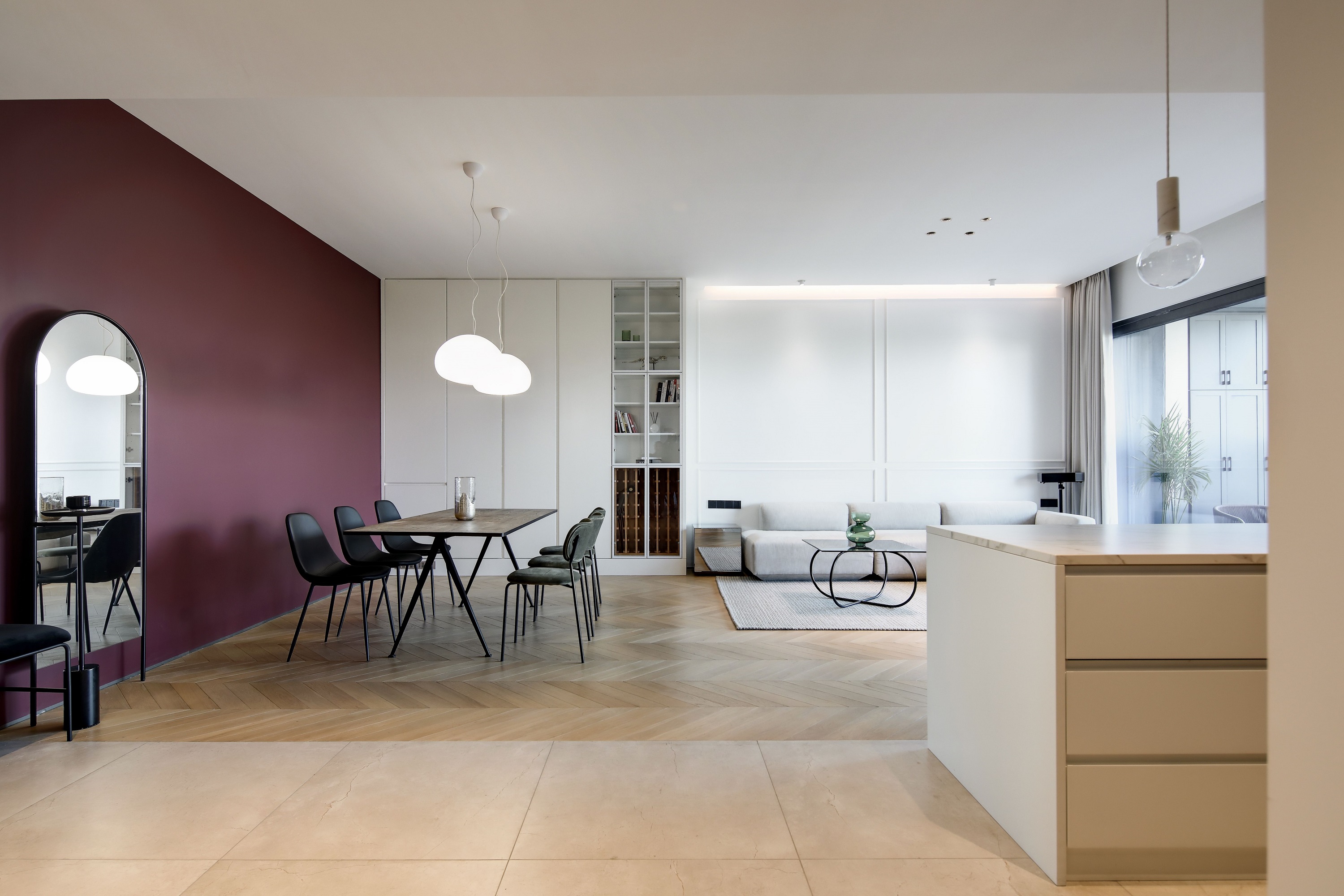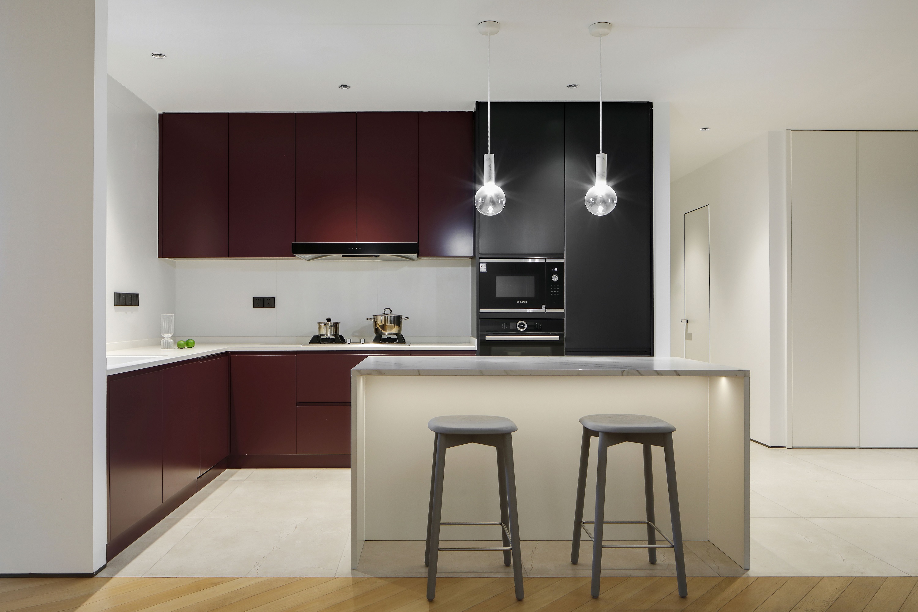 打通墻體后,廚房和客餐廳多了連接,更顯通透。大件家電則選擇“隱身”,空間姿態更輕薄簡約、收納力足夠,同時延續著瑪薩拉酒紅和風暴綠的撞色氣質。