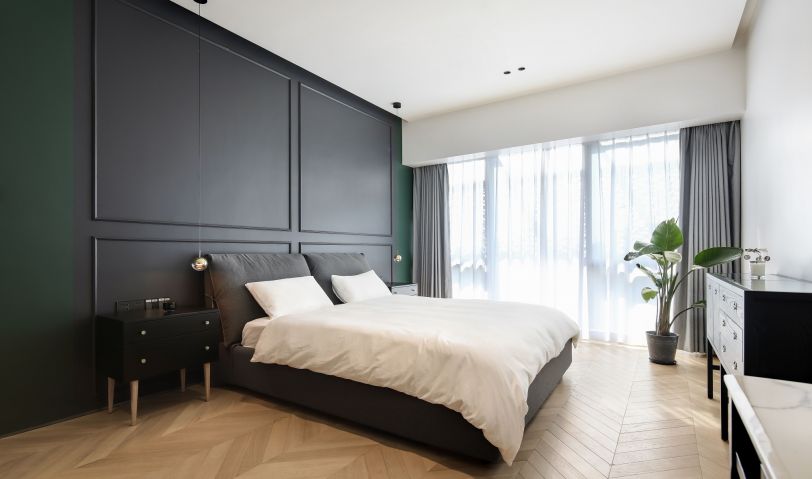 悄然推開門,寧靜的色彩掠去心中浮躁,暖色的魚骨拼木地板調和出空間的平衡,飄逸的白紗,清風拂過,就好像輕柔地吹在心上。拉上遮光窗簾,隔絕喧囂、攏住浪漫~