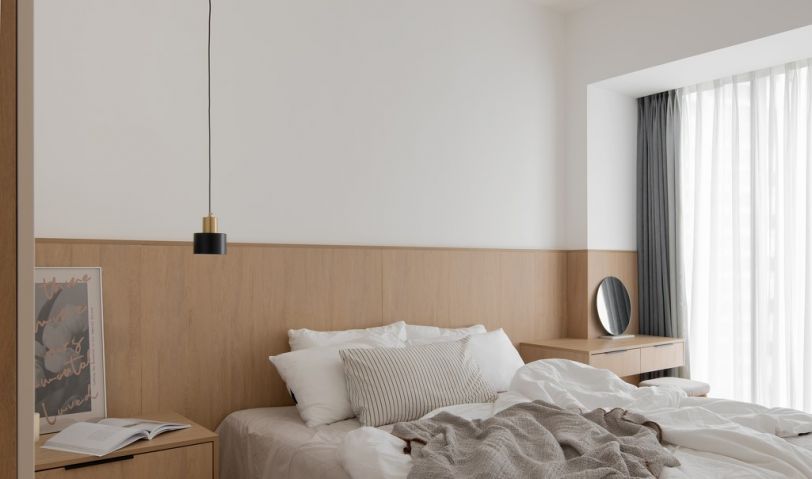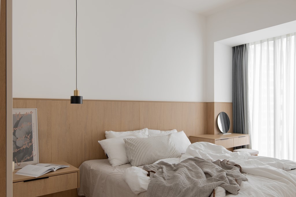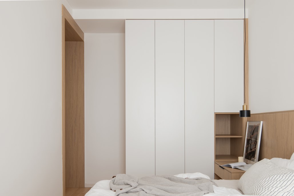 主臥室采用整體定制,衣柜、床頭柜、床頭背板、梳妝臺(tái),整體定制,節(jié)約空間,不留衛(wèi)生死角。整體材質(zhì)統(tǒng)一,顏色干凈明亮。