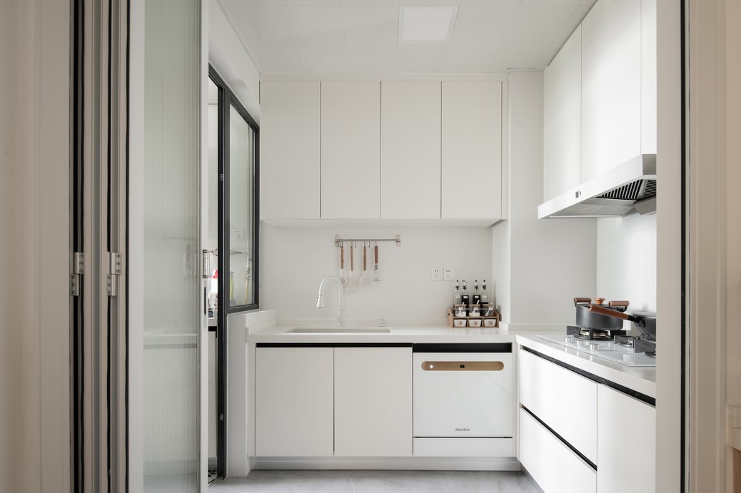 廚房使用純白色的櫥柜及墻磚,盡顯干凈溫馨。地面使用淺灰色地磚,耐臟好打理。墻面使用白磚并做同色美縫,使墻面看起來(lái)更加整體統(tǒng)一。適合非常適合愛(ài)干凈的屋主