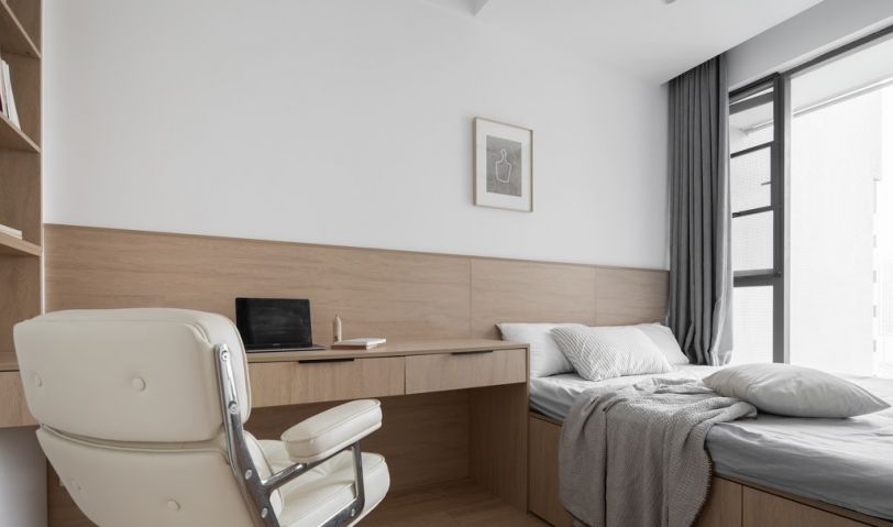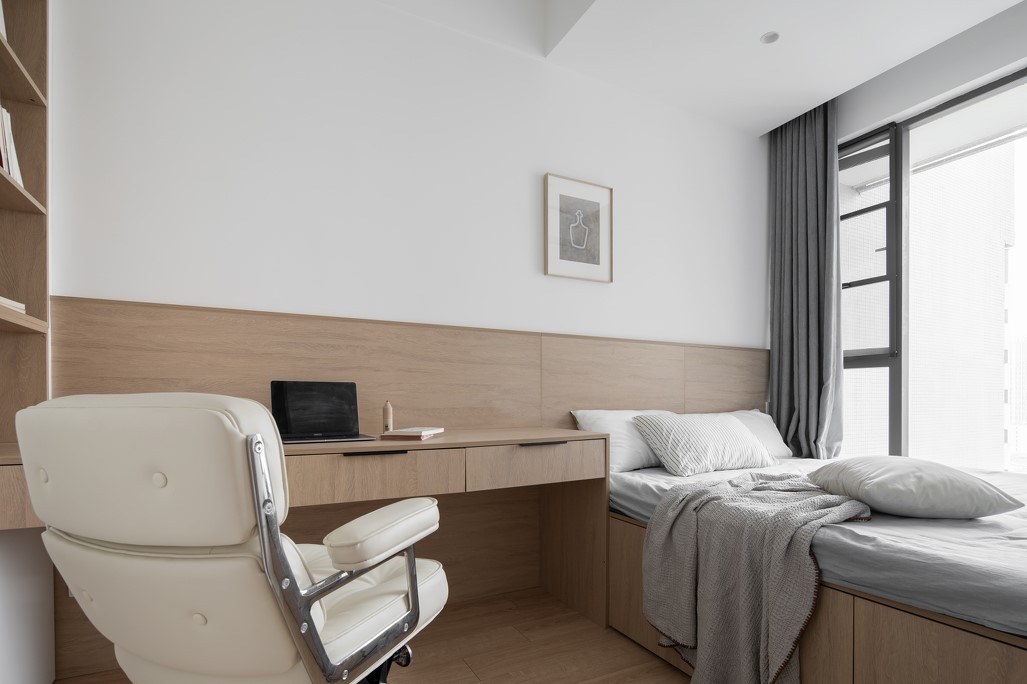 改造后的書(shū)房,面積雖然縮小了,但是使用率卻沒(méi)有打折,空間也變得方正。衣柜、雙書(shū)桌,1.8米榻榻米,都完美的安放進(jìn)去了。滿(mǎn)足日常2人的書(shū)房需求,也可以做客房。門(mén)口使用磨砂玻璃的推拉門(mén),增加了西廚區(qū)域的采光。