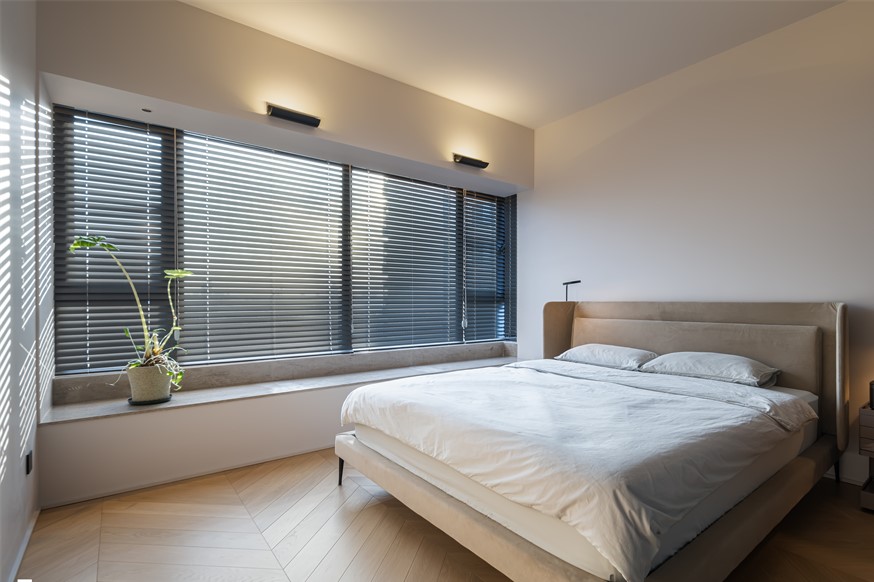 選擇投影或電視?成年人當(dāng)然是都要。不需要專門安裝幕布,僅僅是普通淺色乳膠漆就可以有不錯的投影效果,因此大床面對的墻壁沒有任何裝飾,我們躺在這里看電影,打游戲,不亦樂乎~