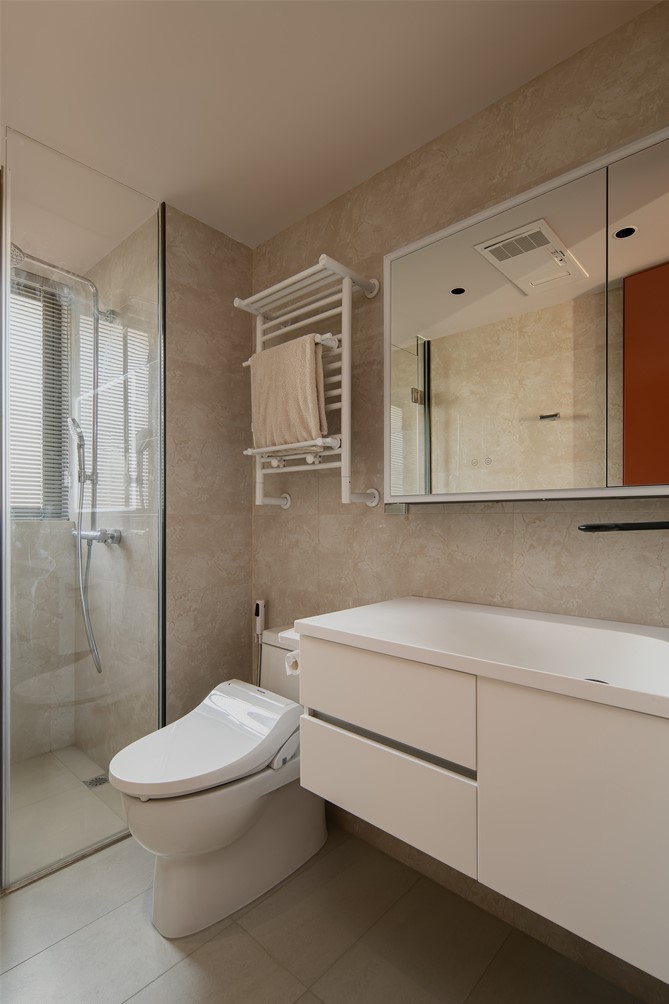 衛(wèi)生間在保留原精裝修基礎(chǔ)上,加裝風(fēng)暖、電熱毛巾架、智能馬桶蓋,并更換鏡柜(內(nèi)有插座開關(guān))、浴室柜和花灑套裝。