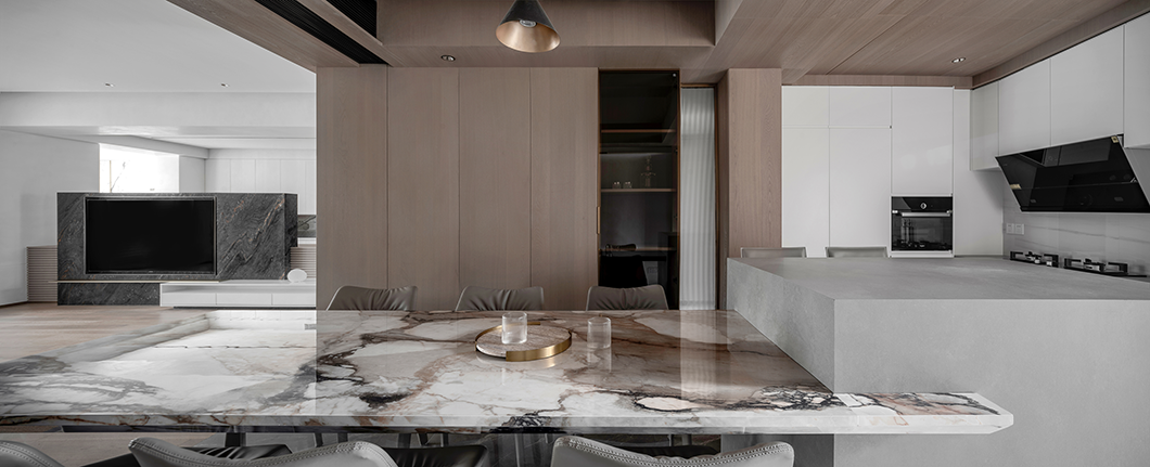 開放式廚房與餐桌島臺圍合著歸屬感,將空間之間的互動性作為塑造空間的元素,與精心挑選的各式材質拼接組合,突顯出魚肚金餐臺的特征,形成與眾不同的空間體驗。