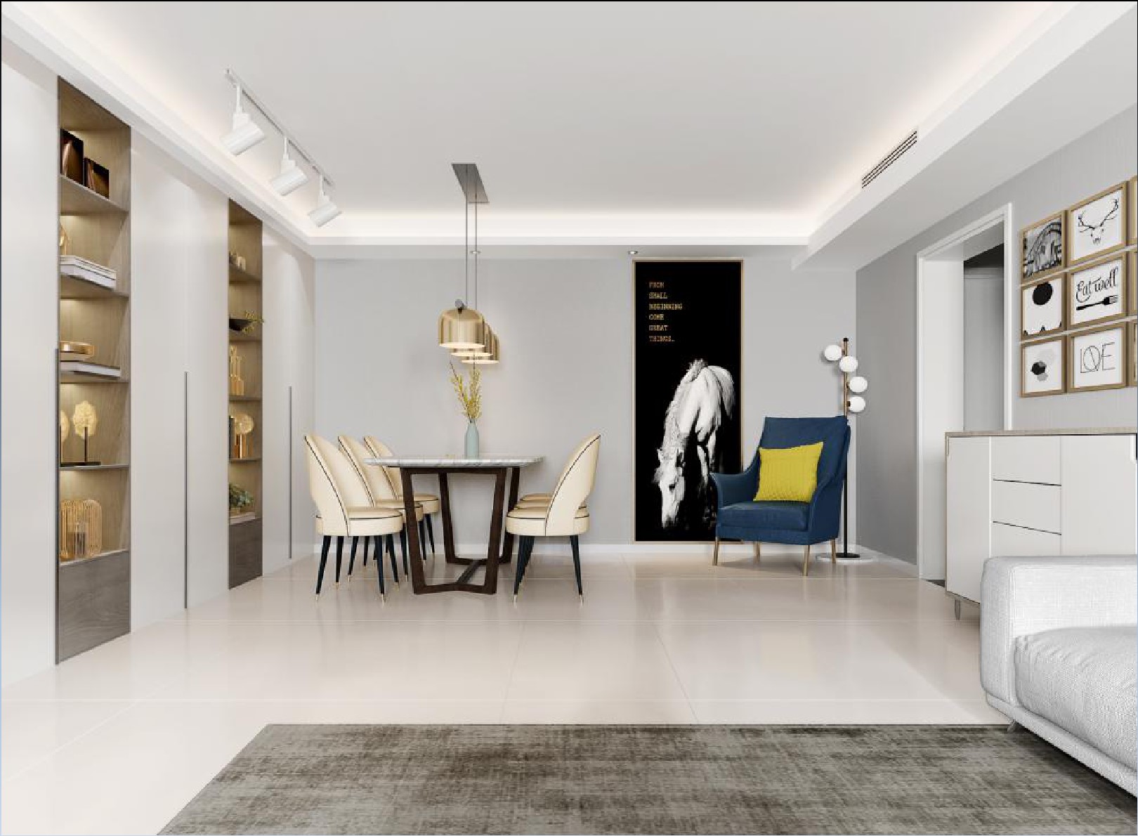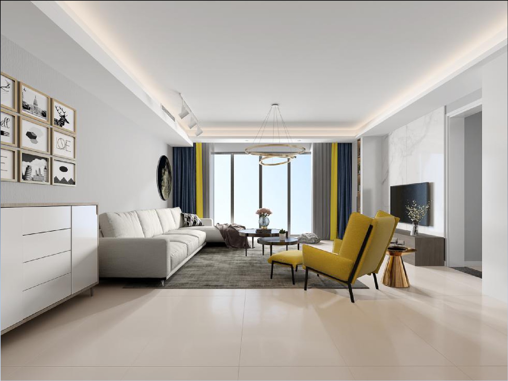 在客廳色調(diào)的選擇上,以淡雅的暖色調(diào)為主。運用黃色的單人沙發(fā)作為跳色,通過大理石電視背景墻與藝術品的懸掛和燈光的使用,營造空間的時尚感