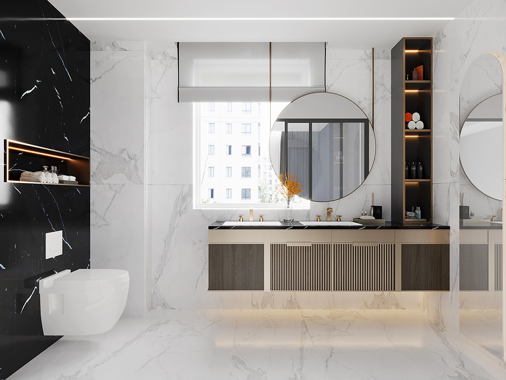 用不規則弧形沙發更好的利用空間,增加了整體的靈動性,大理石石材電視背景墻嵌入極光電視,整體簡約又大氣。