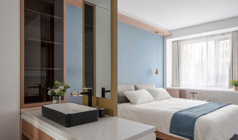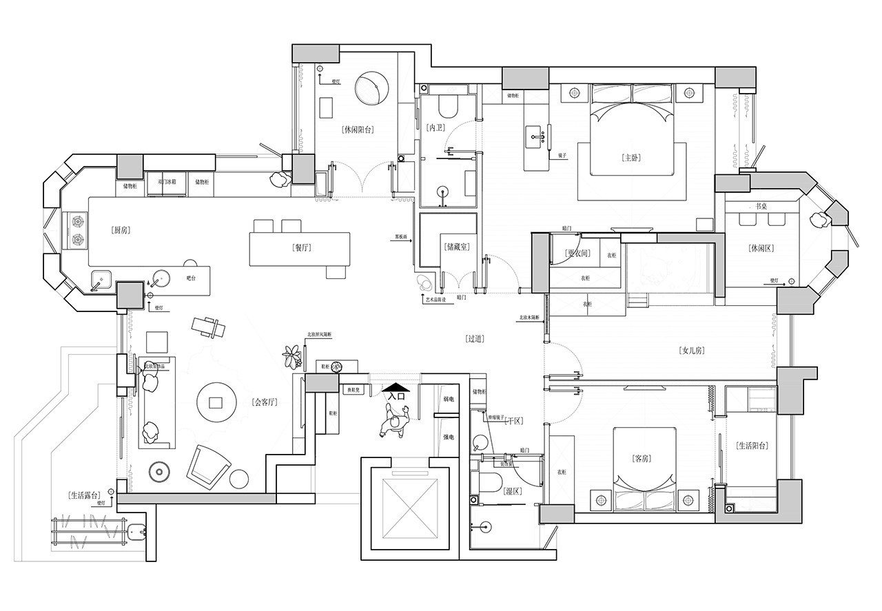 業主家中六口之家,兩個女兒,以及父母,注重各自空間隱私,主臥的生活工作一體化設計。公共空間較大利于孩子游樂,學習。生活陽臺與洗曬陽臺區分開。