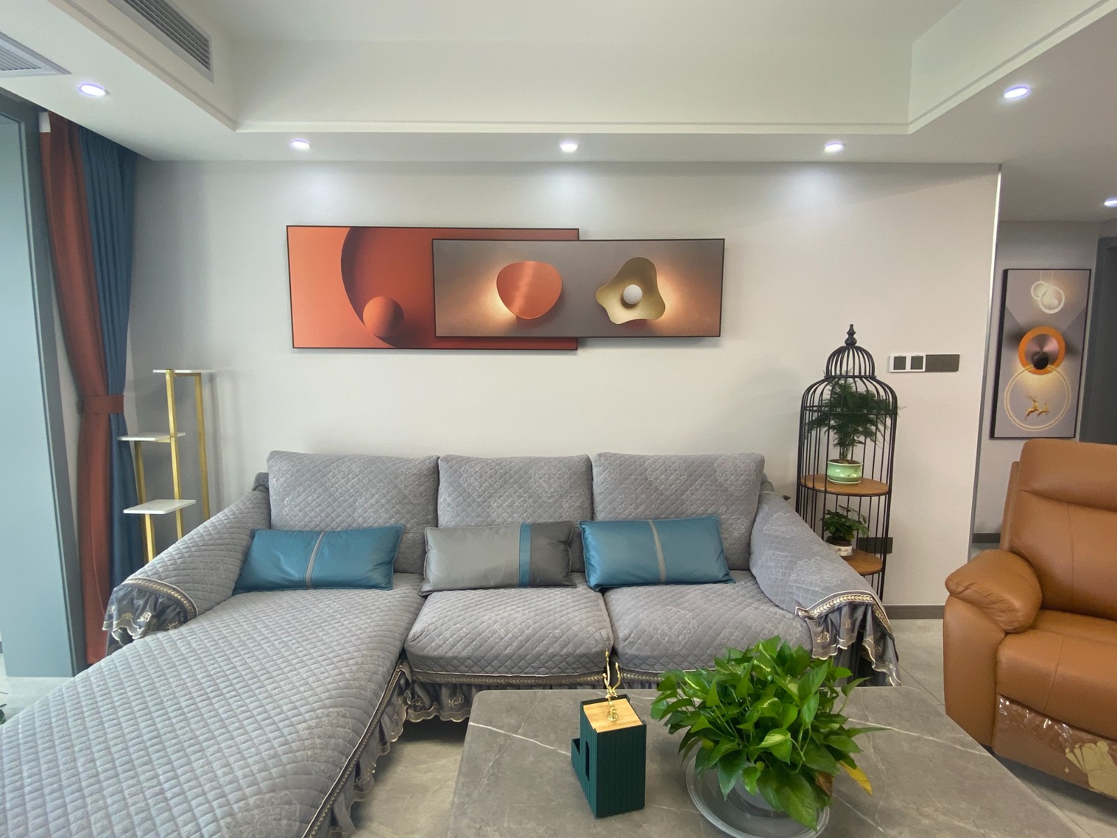 客廳整體簡約大氣,白色的沙發背景,因為藝術畫的存在更具神秘藝術元素,搭配布藝沙發,整體通透