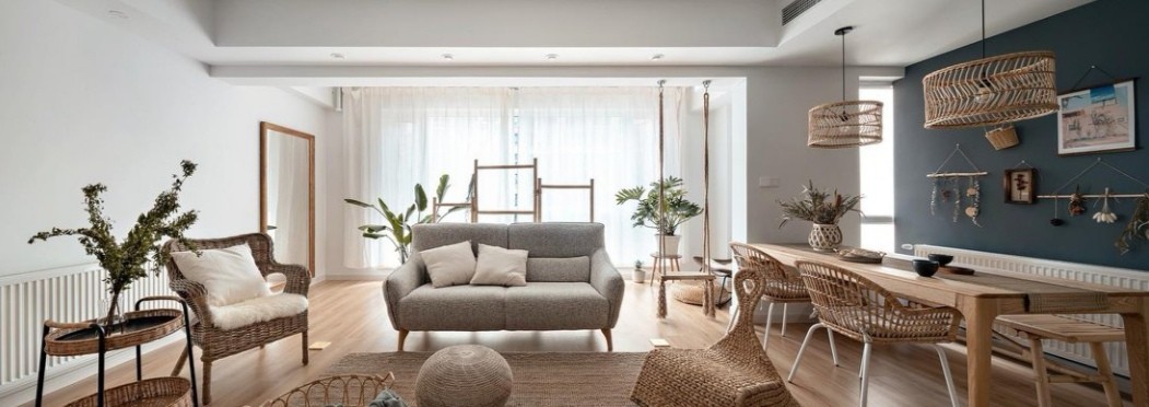 將原結構中的電視墻轉了90度,并把走廊融進客廳區域里