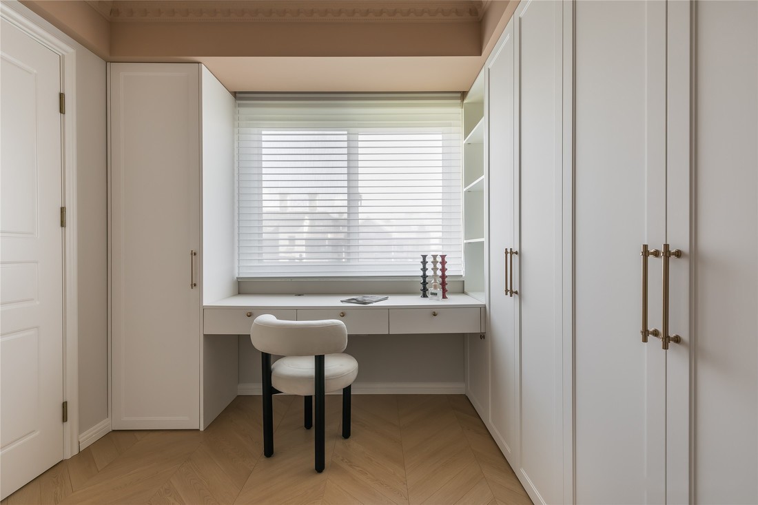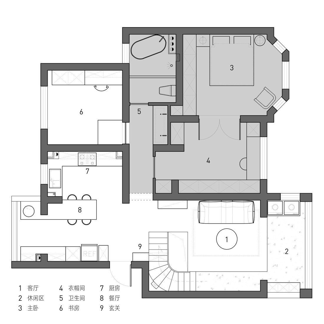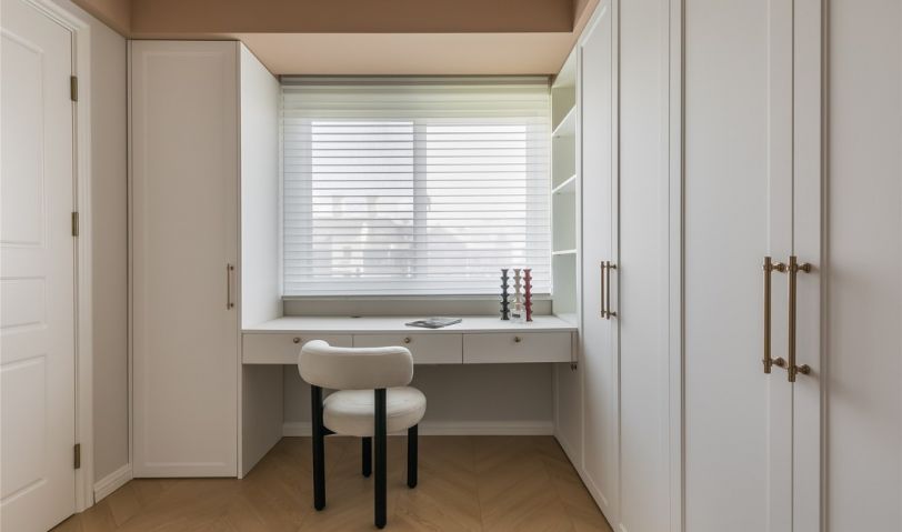 閱讀角與休息角,顛覆了空間的單一性,保留并發揮出陽光充足的優勢。未做任何隔斷與形式上的分區,簡單的一面柜子與一把沙發椅,就塑造了無限的可能性,希望居住者在此自由探索空間的意義