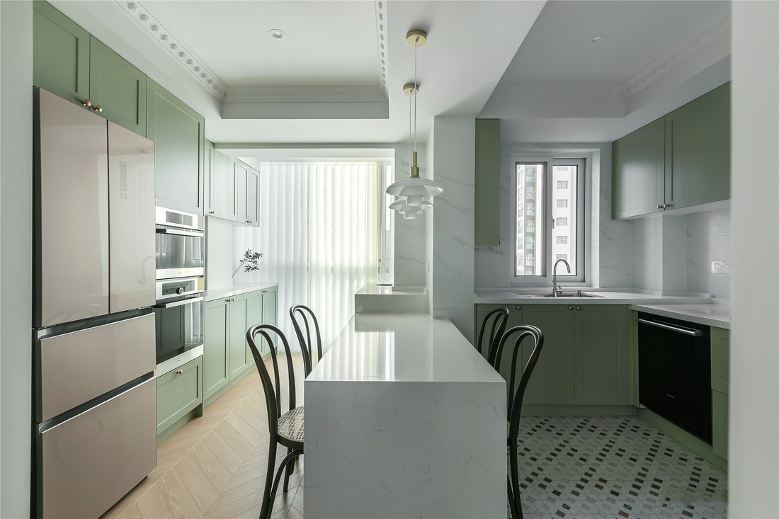 在材質、色彩、形狀的不斷變化中,廚房與水吧臺之間形成了一種互動式的藝術。各種體塊的藝術穿插,創造了更多隱形的收納空間,輕盈、通透、干凈、有序的感覺撲面而來