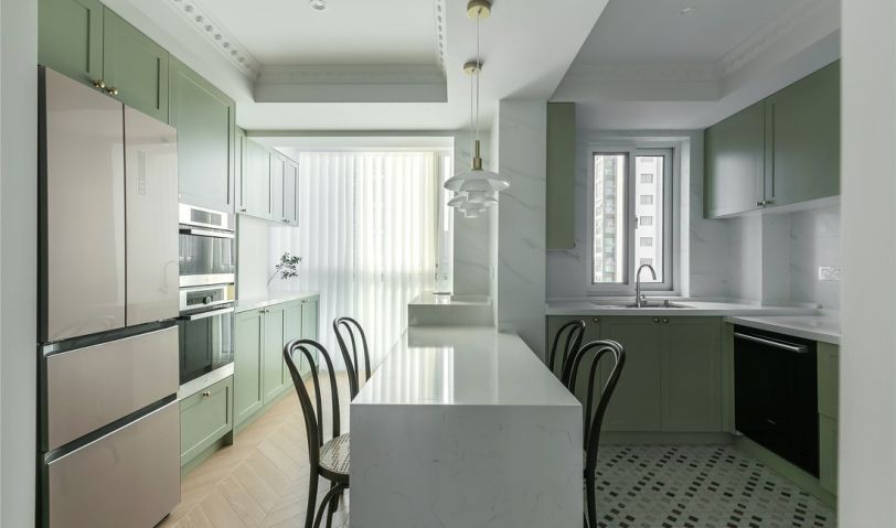 設計從傳統的廚房結構里跳脫出來,將嵌入式家電與櫥柜結合