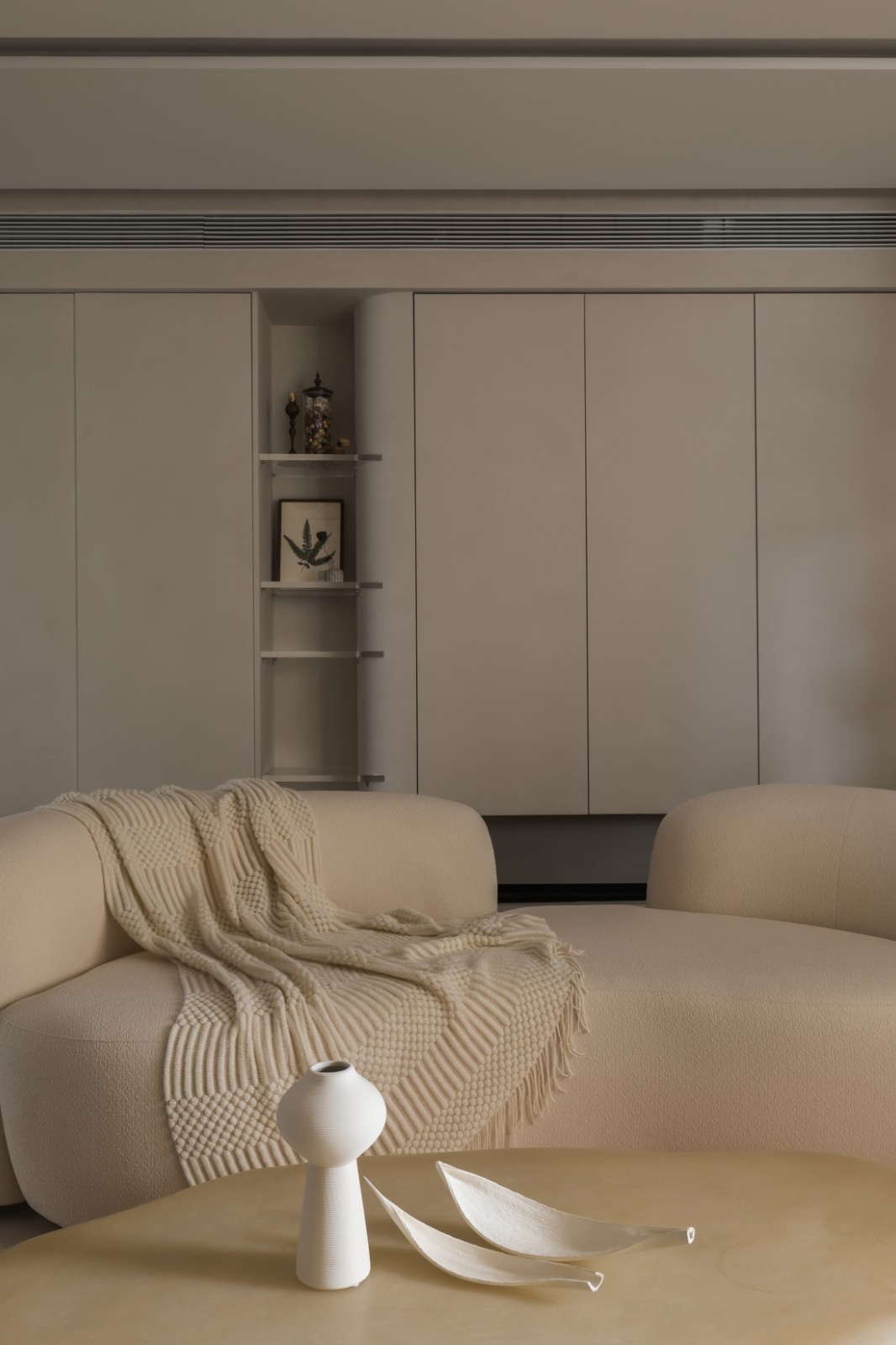 因為客廳面積較大,視距過長,在背景墻打造一組收納柜,同時將沙發(fā)擺放在中間,既能增加儲物空間,也讓公共空間形成回字形路線,從進門到餐廳—客廳—陽臺—書房,動線方便快捷。 收納柜也做了一些巧妙的設計,增添視覺上的趣味性,中間分設開放置物格,同時以弧面收邊,直線與曲面的交合更具有設計感,層次和視覺效果更為豐富