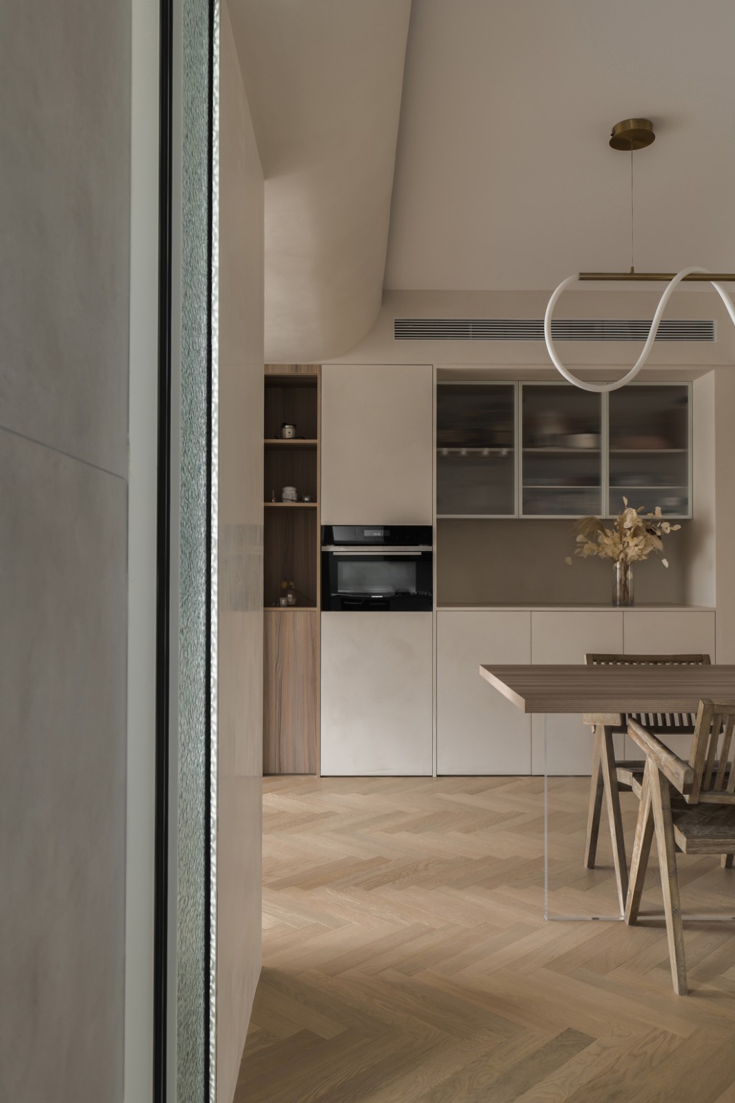 吊頂仍然以曲面過渡層次,銜接流暢自然。餐廳背景墻打造頂天立地餐邊柜,微水泥材質(zhì)與木質(zhì)形成視覺對比,層次更為豐富,嵌入大型廚電,為中廚節(jié)省空間。玻璃吊柜和開放格的設計,讓收納充足的同時也保證了視覺的輕盈感。