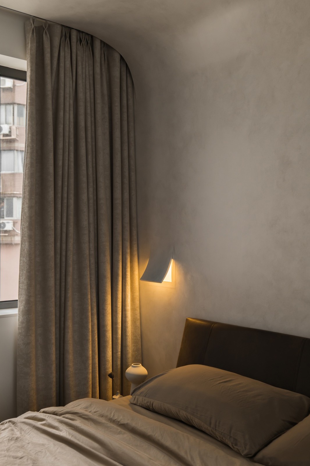 臥室的背景墻與頂面用弧面過渡,形成一體,墻面與吊頂都采用微水泥材料,視覺上形成鐵一體,增加視覺延伸感,微水泥的獨特紋理與質(zhì)感也讓臥室更具有自然、質(zhì)樸的氣息