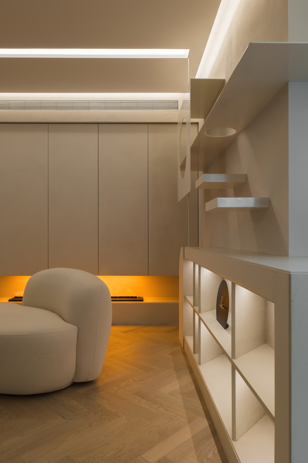 側(cè)面以擱板和展覽柜裝飾墻面,既能豐富墻面層次,也能用以展示屋主夫妻喜愛的珍藏,增添空間格調(diào)與品質(zhì)。收納柜沒有做到底,在下方留空一部分,不開燈時視覺更顯輕盈,開燈后搭配暖光燈帶,形成仿壁爐設計的視覺效果,增添氛圍感
