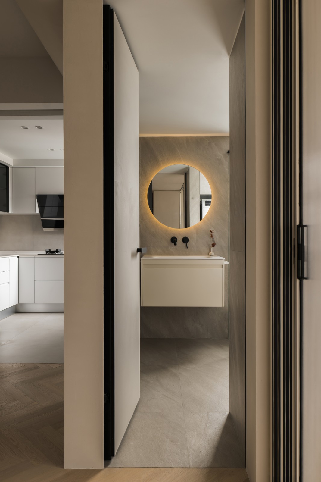 洗手間的布局經(jīng)過精心考量,將干區(qū)設置在正對門體的方位,即使不管上門也比較美觀,懸空式浴室柜、一體式臺盆、入墻式水龍頭和圓形浴室鏡,看上去簡潔大方,顏值和實用性兼有