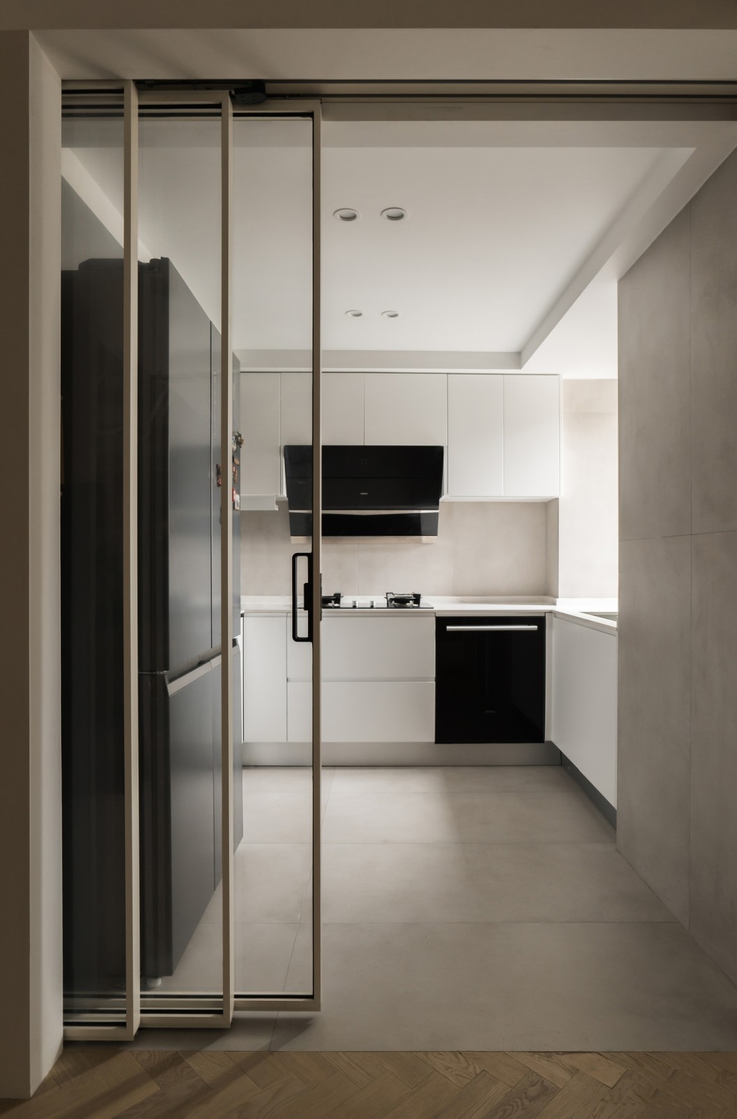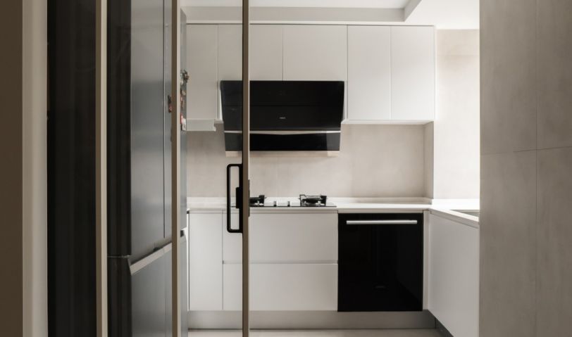 廚房采用上軌道玻璃移門,合起來時可以藏進墻壁后,秒變開放式廚房,有需要時展開,隔絕油煙,便利又美觀,廚房鋪貼地磚,與餐廳的木地板采用無壓條拼接技術(shù),視覺上更為簡約美觀,墻地一體,視覺上更為開闊舒適