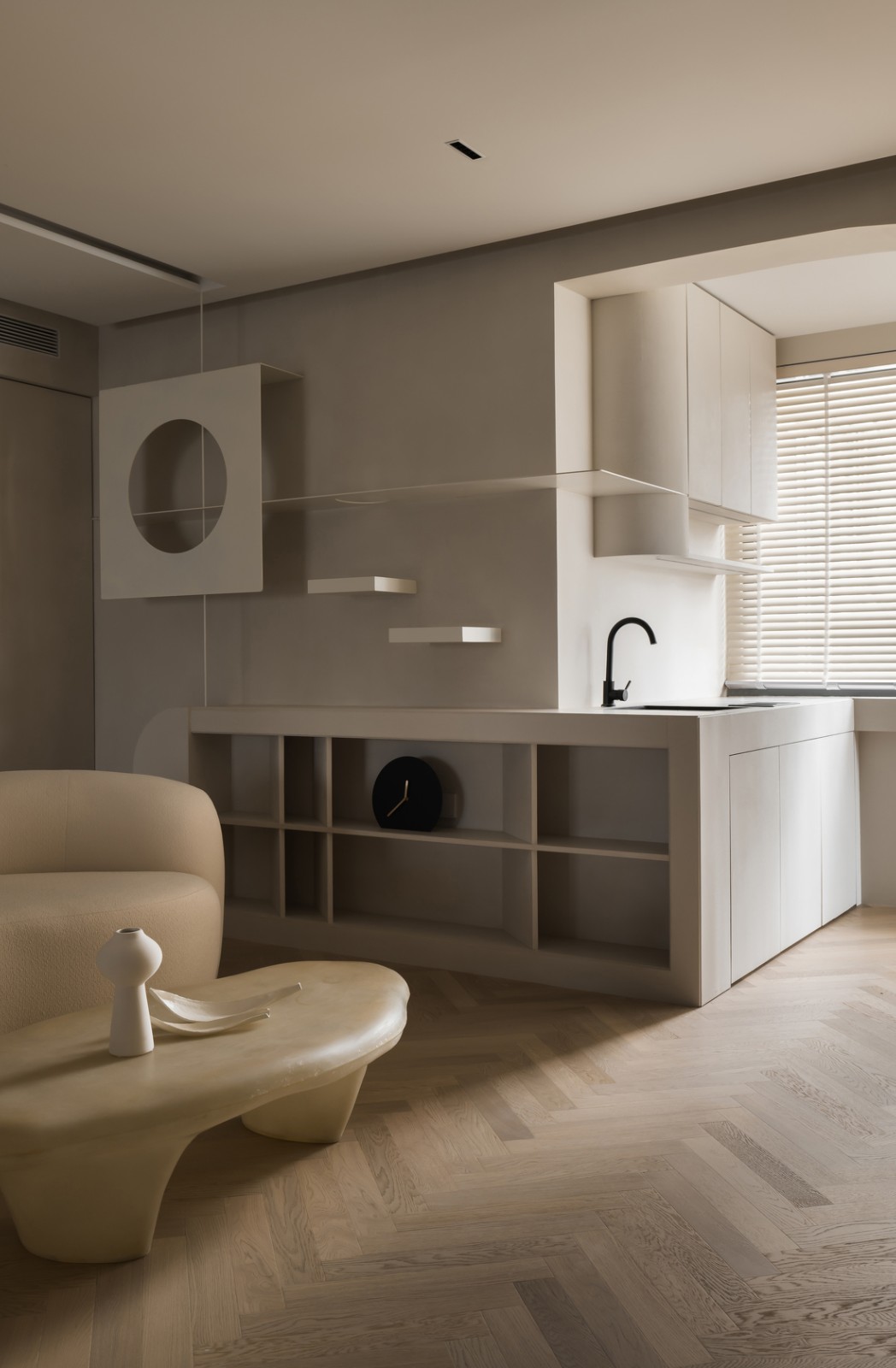 客廳與陽臺之間沒有隔斷,將陽臺打造為簡約的西廚區(qū),方便屋主夫妻進行輕松愉悅的下午茶時光,以裝飾柜為連接,在轉(zhuǎn)角延伸過去,打造水池及操作臺,同時上方與下方均置收納柜,增加儲物空間