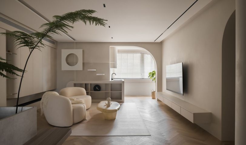 空間整體以素雅安靜的低飽和色為主,選擇奶油色系,讓空間在清簡寧靜的同時,也有家的溫馨和溫度。客廳的布局也遵循自然簡約的原則,平面吊頂、無主燈設計、同色系的軟裝,讓空間視覺趨于一體,更為融洽,與陽臺之間的門洞采用弧形線條勾畫,結(jié)合空間的奶油色調(diào),更加溫柔流暢