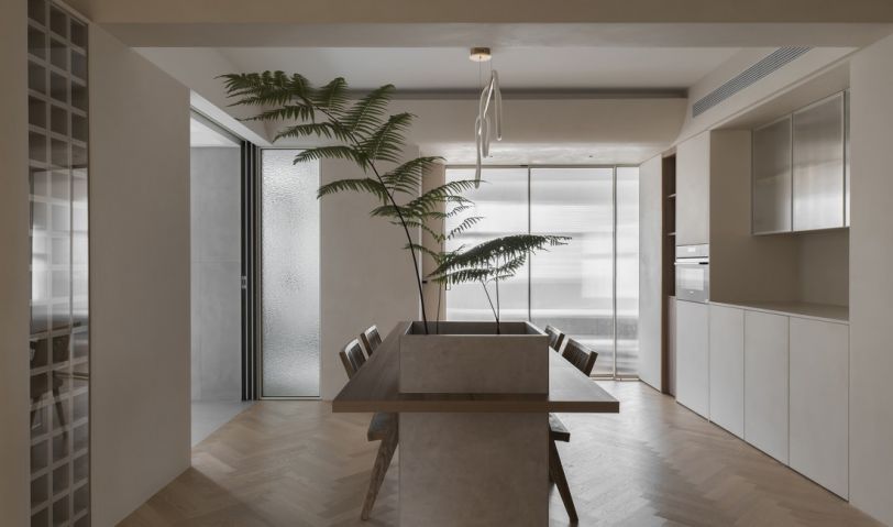 餐桌+石臺居中擺放,對餐廳也形成洄游動線,餐廳-廚房-洗手間-次臥之間的動線彼此連通,更為便利。廚房與洗手間銜接的墻體選擇用壓花玻璃作為隔斷,視覺效果更為通透,同時也讓洗手間內(nèi)的采光更好。