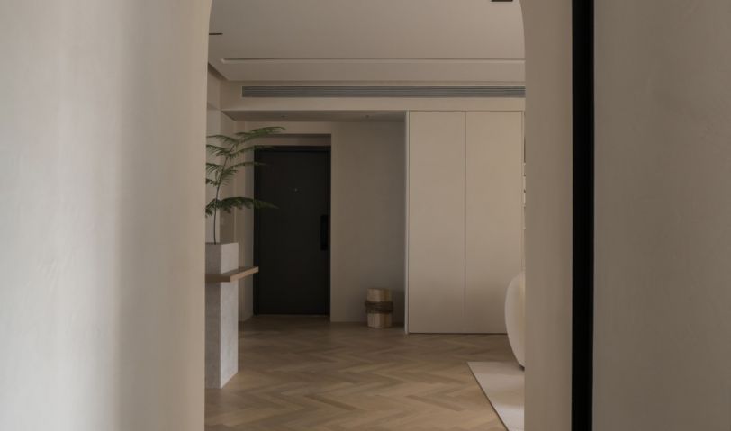 從走廊視角看向玄關(guān),本案是無玄關(guān)戶型,屋主夫妻也喜歡開闊寬敞的空間,所以并未加增隔斷打造玄關(guān),在左右兩側(cè)分別打造收納柜,玄關(guān)柜與餐邊柜視覺上合為一體,既滿足出入戶需求,看起來也整潔干凈