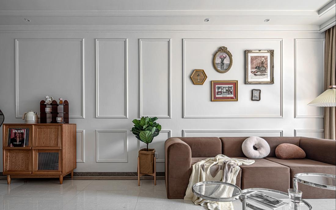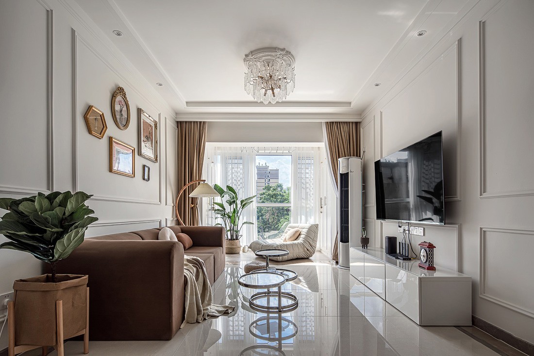 客廳仍然是沿用白色的基調,沙發背景墻和電視背景墻的采用了PU線條裝飾,在沙發背景墻中放置了精致復古的裝飾畫,使整個墻面看起來不至于太單調,與電視背景墻相呼應,搭配了簡約的白色電視柜和富有設計感的小茶幾,顯得精致而優雅1