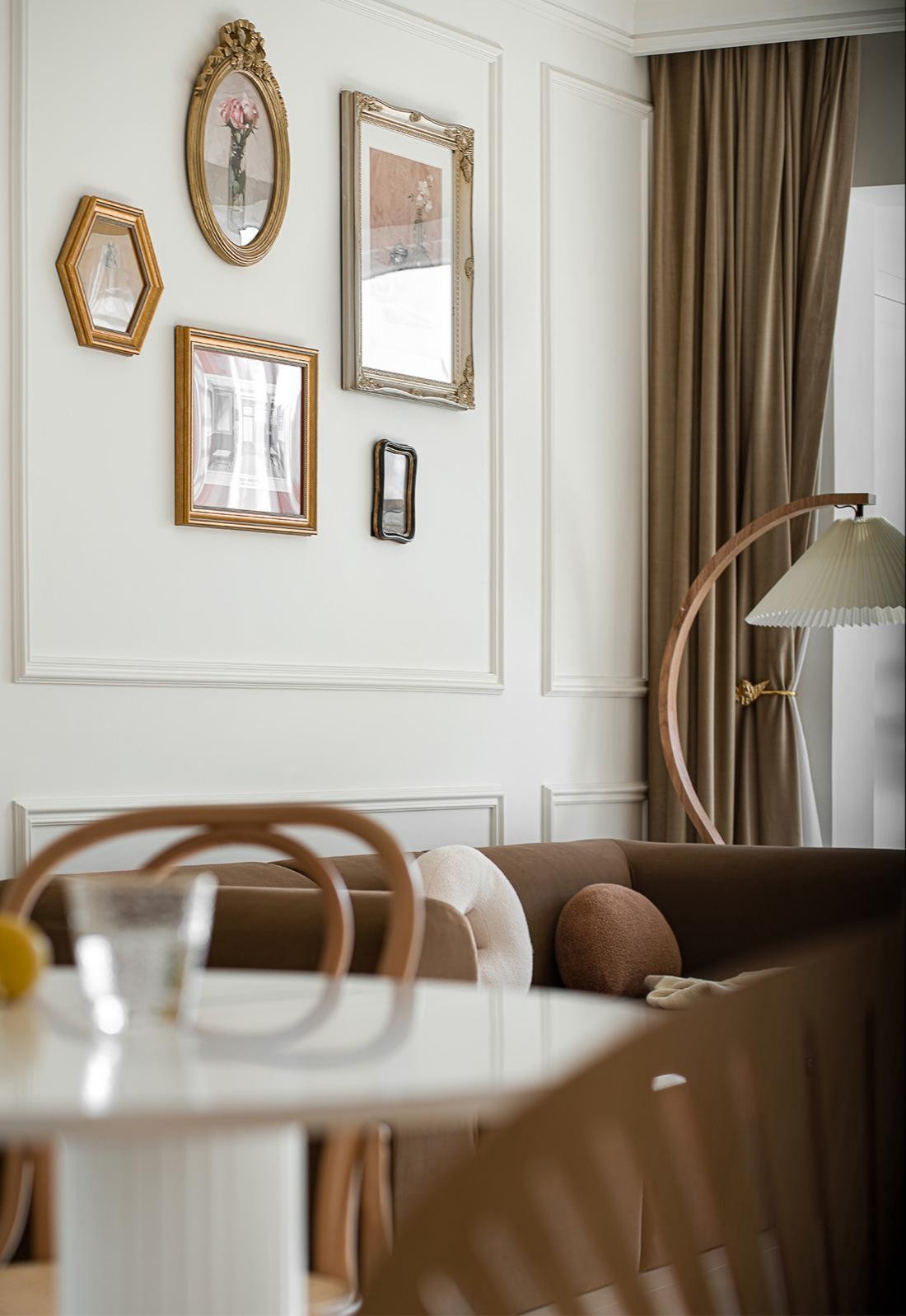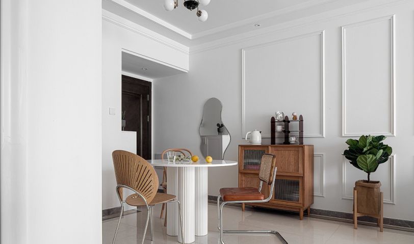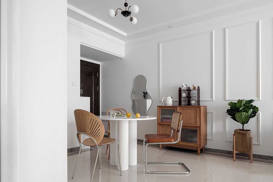 餐廳跟客廳是打通的,淡粉色的墻紙點綴整體空間的溫馨感,復古色調的凳子和置物柜跟客廳的墻畫保持一致的調性,不規則鏡子使得讓這區域無形中變大了,小小的空間,也可以不失格調。