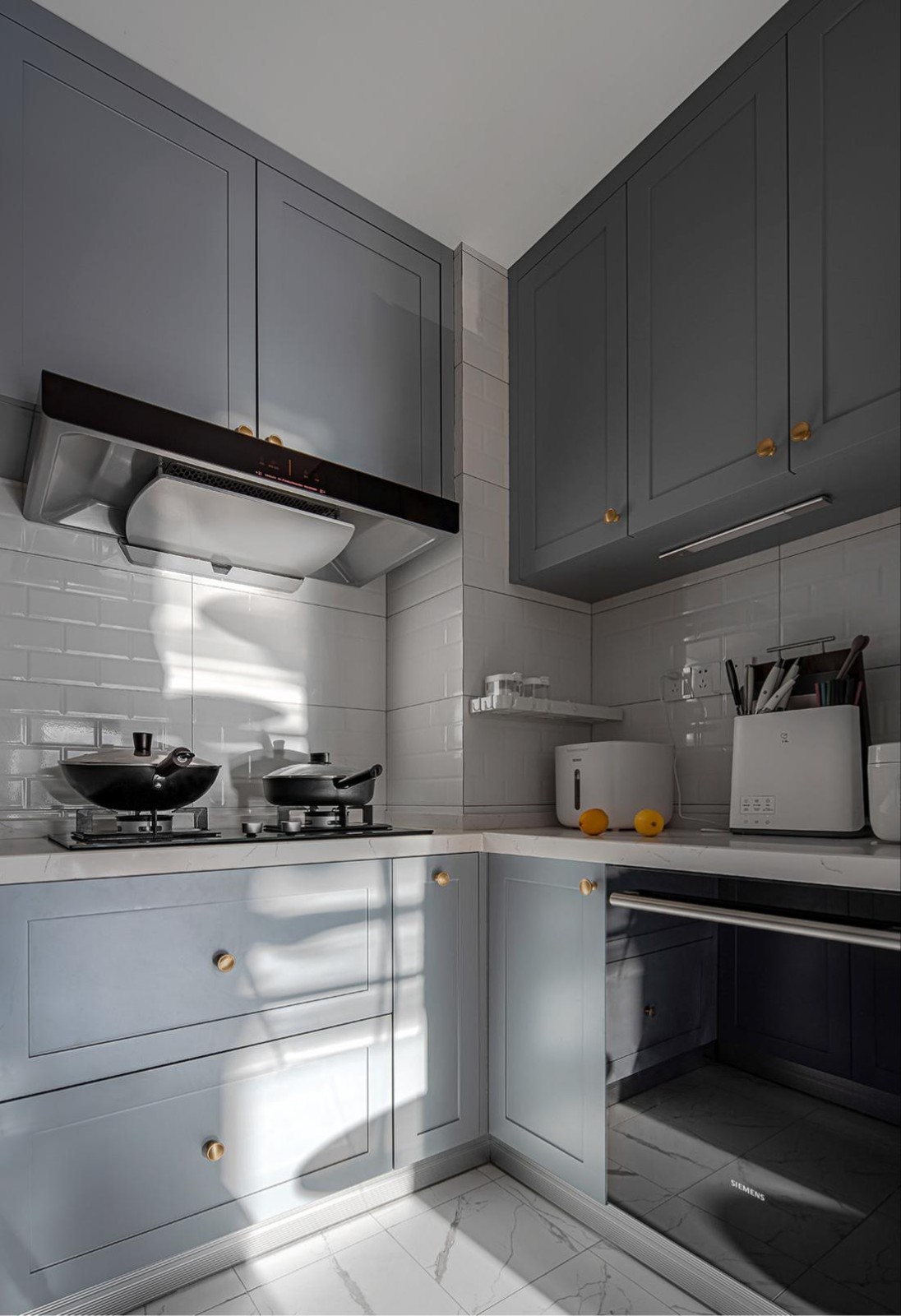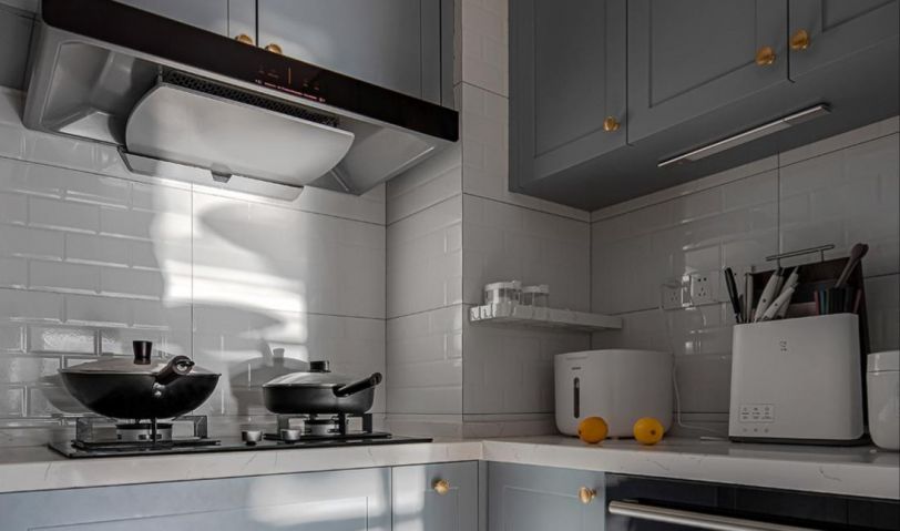 廚房更換了櫥柜門板之后,整個氣質便煥然一新。簡潔明亮的白色調墻地磚和灰藍色櫥柜,提升了整個廚房的層次感,明顯看出比改造前更寬敞、明亮。餐廳與廚房緊密相連,色調搭配合理,營造出一種溫馨、和諧的氣氛