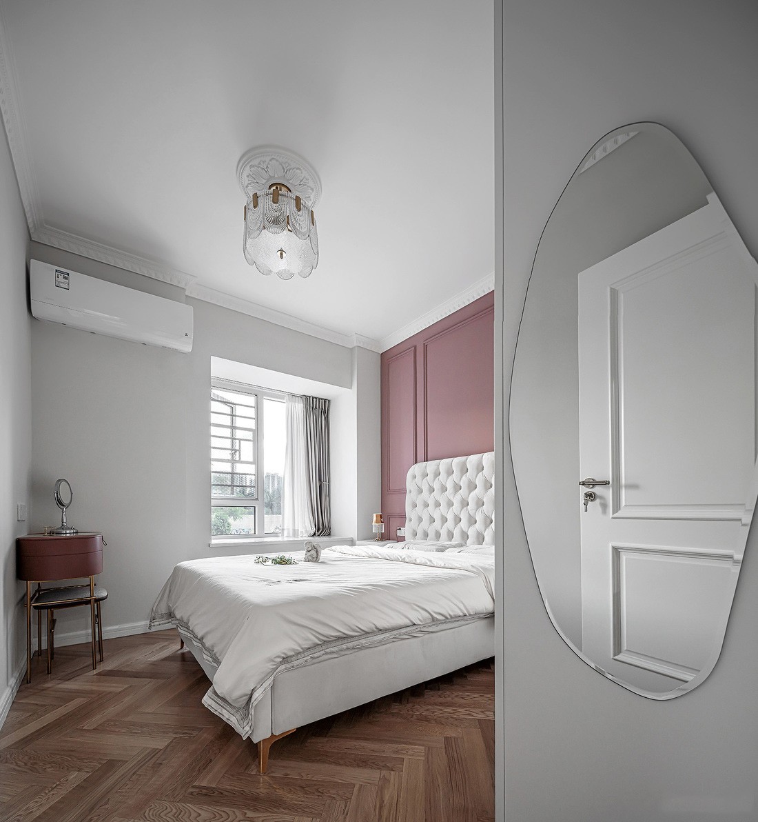 主臥的床頭背景墻采用了粉紅色的墻漆,自然、清新的色調散發出幸福的味道,營造溫情與浪漫的氛圍。飄窗也不失為一個愜意之地,慵懶地靠在抱枕上,品茶賞景,豈不快哉1