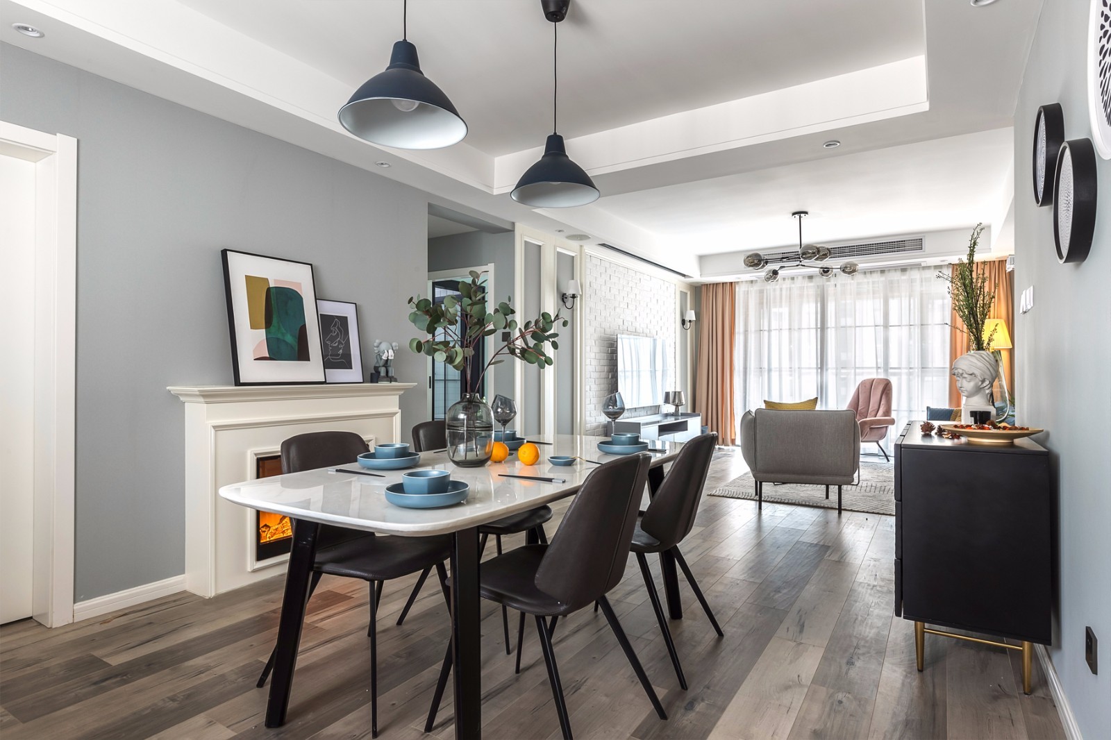 在客廳的設(shè)計(jì)上,設(shè)計(jì)師以內(nèi)斂的灰色調(diào)打底,塑造出一個(gè)靜謐安定的空間氛圍。透過對(duì)軟裝家居材質(zhì)的混搭,及初冬壁爐中的火焰緩緩的升起讓給生活帶來更多的儀式,使整個(gè)空間精致而不張揚(yáng),沉謐簡寧的氛圍