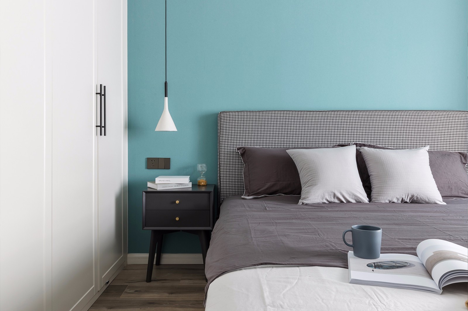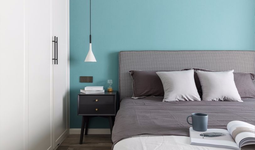 主臥軟裝延續(xù)了本案雅致北歐的視覺定調(diào),床品選用了千鳥格的床頭靠背,灰度的床單質(zhì)感與舒適度呼應(yīng)著空間主人的氣質(zhì)與品位