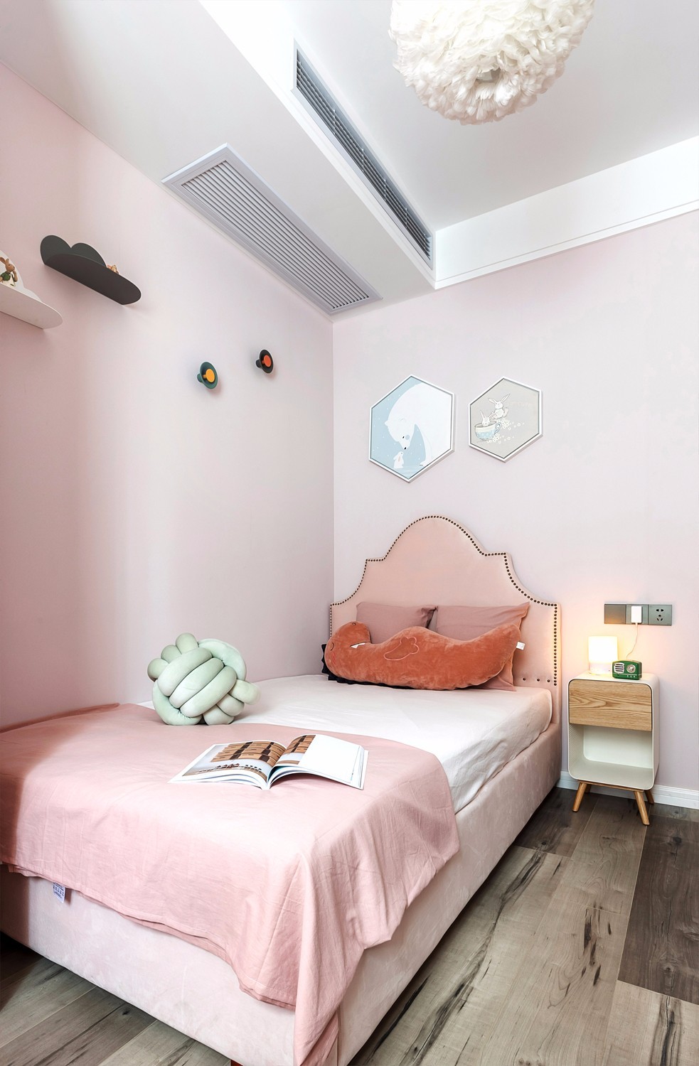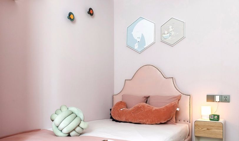 每個(gè)女孩都想著有一個(gè)粉嫩的空間,設(shè)計(jì)師采用了淡粉色的墻紙,結(jié)合一些兒童趣味的掛件裝飾,藍(lán)天 、白云、及精致的裝飾羽毛吊燈,使空間整體更加的趣味與溫馨