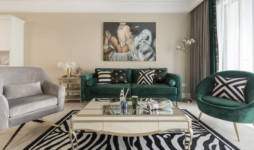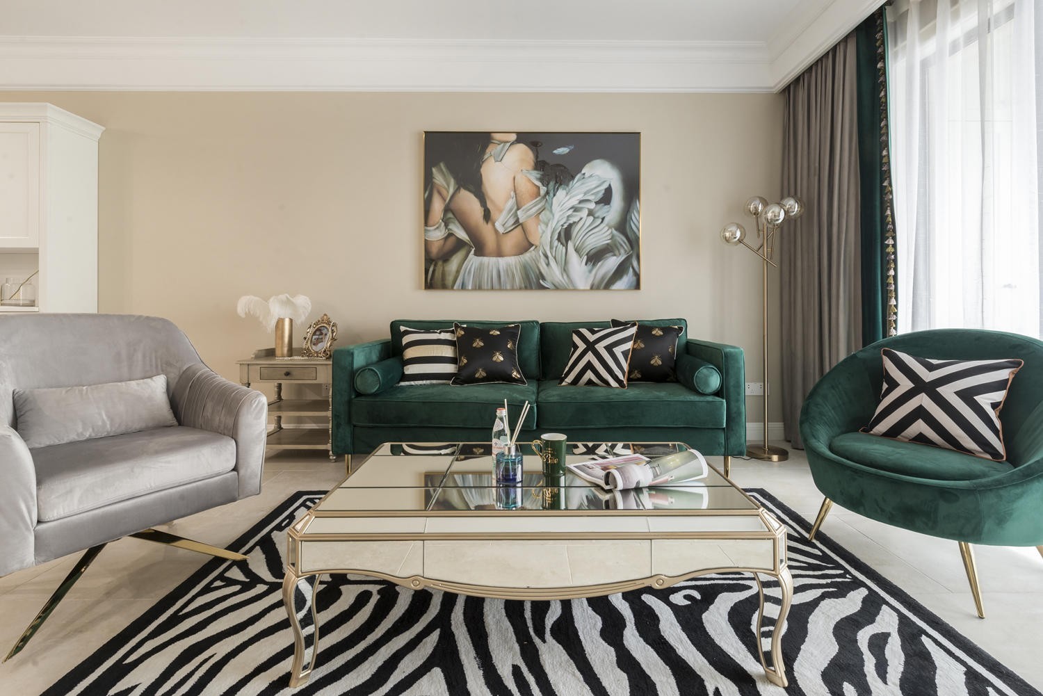 業主為中年夫妻二人,家里常住人口為三口人,加一個高中女兒,所以業主想把家裝的比較豪華,看上去比較高端大氣上檔次。為了讓整個客廳看上去不至于太過于單調或者單一,加了一些墨綠元素以及黑白進去,讓客廳更富層次感。