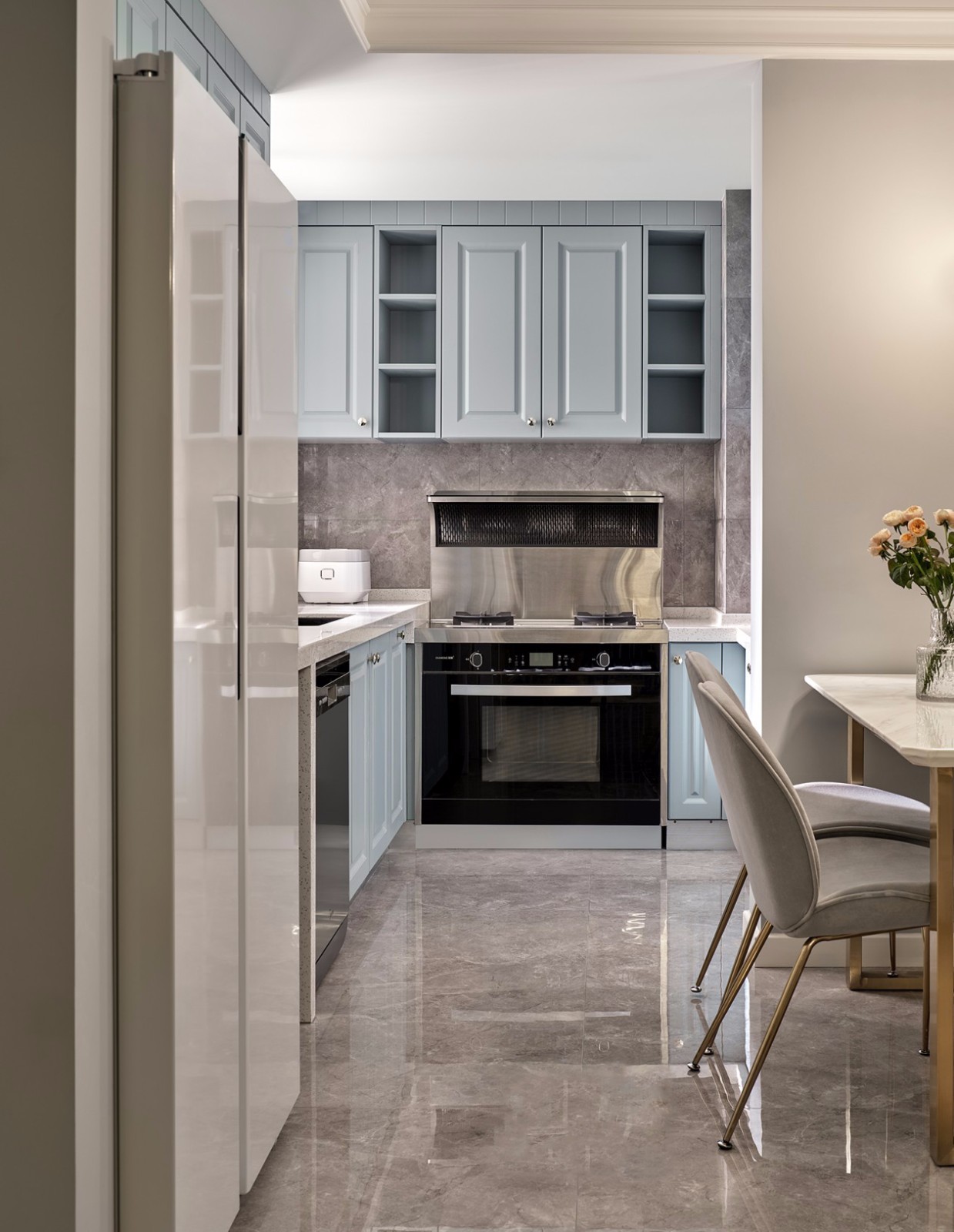 L型廚房操作臺面節約空間,大理石花紋地磚配上墻面線條造型讓空間更具層次,同時拉伸視覺效果。金屬燈具、餐椅的加入,讓空間更顯質感。