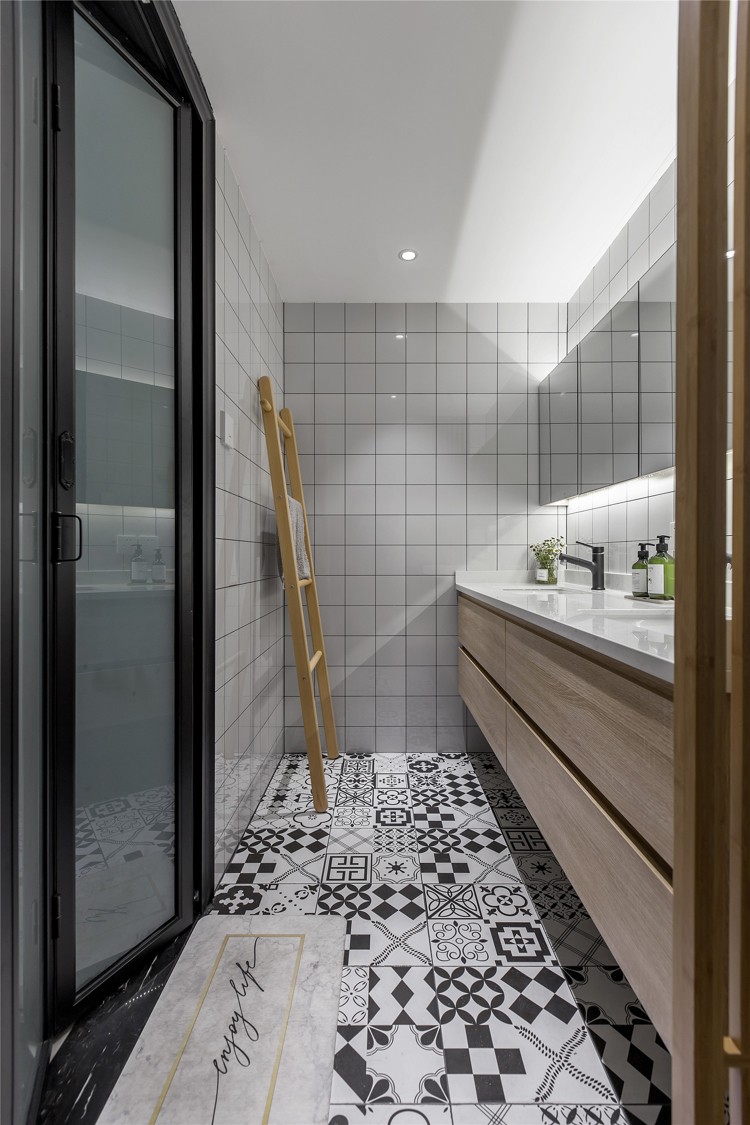 衛(wèi)生間由于要大量用水,設(shè)計(jì)師考慮到潮濕、防滑、清潔的功能,便以鋪瓷磚為主,在墻地磚的花紋、款式上做了不同的選擇,整個(gè)空間就變得活波靚麗。