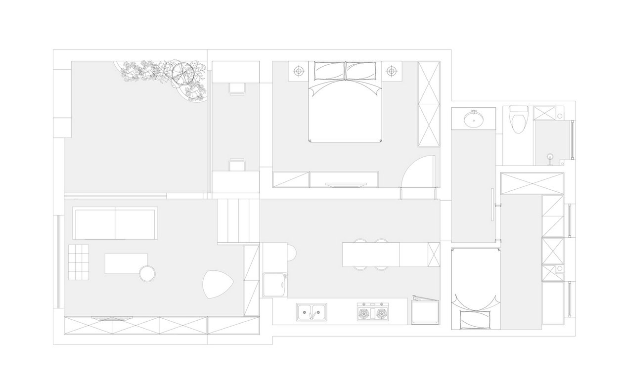 原木色元素體現在開放式櫥柜中,以局部的黑色點綴,散發出溫暖的生活氣息。開放式吧臺