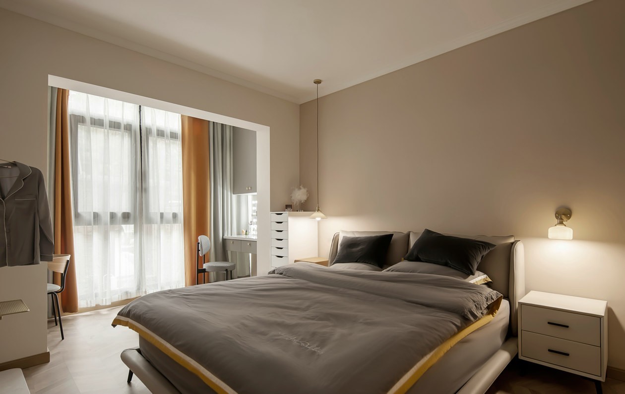 靜謐的臥室,以光以色彩調和空間情感,橙色為點睛之筆,將暖的主題延伸到家里的每一處。一面藕粉色床頭背景墻,與空間的灰白色,營造出層次感。精心挑選的一白一橙床頭柜,突破了常規搭配,讓空間更出彩。
