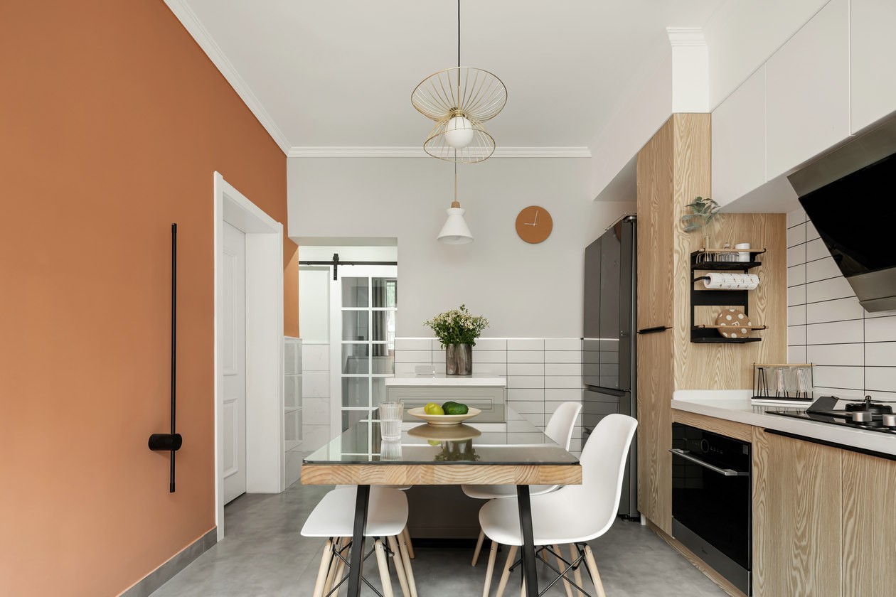 廚房:一整面橙色餐廳背景墻,象征著熱情,用一只橙色的裝飾鐘與背景墻呼應,像家中升起一只小太陽,豐富視覺體驗,拉近人和空間的距離。