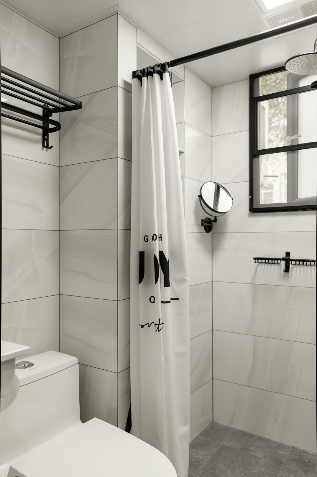 由于衛生間面積不大,選用了浴簾隔檔水汽,同時又不會占用太多的位置,也體現了北歐風的靈活輕盈感。