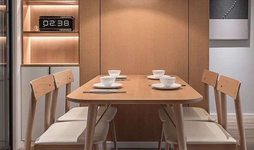 入墻設(shè)計(jì)的餐邊柜收納與展示功能兼?zhèn)洌故靖裰羞€做了藏光設(shè)計(jì),營造溫馨舒適的用餐氛圍。