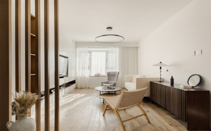 設計中運用了較多木質元素,木地板、木立柱、原木餐椅......利用材質的特性,奠定空間溫暖基調。又通過色調和飽和度的變化,賦予居室變幻之感。