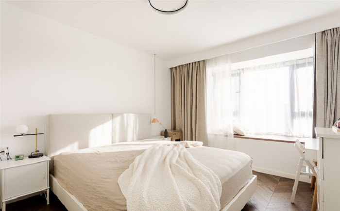 主臥延續(xù)簡約風格,墻頂一體,空間更加朗闊。靠墻打造整墻儲物柜,屋主不再為臥室收納煩惱。柜門按壓式的設計,避免擾亂空間視覺,柜子和墻更加融合。寬闊飄窗鋪上原木材質,陽光溫暖的午后,在飄窗處或臥或坐,靜享生活的靜謐悠閑。
