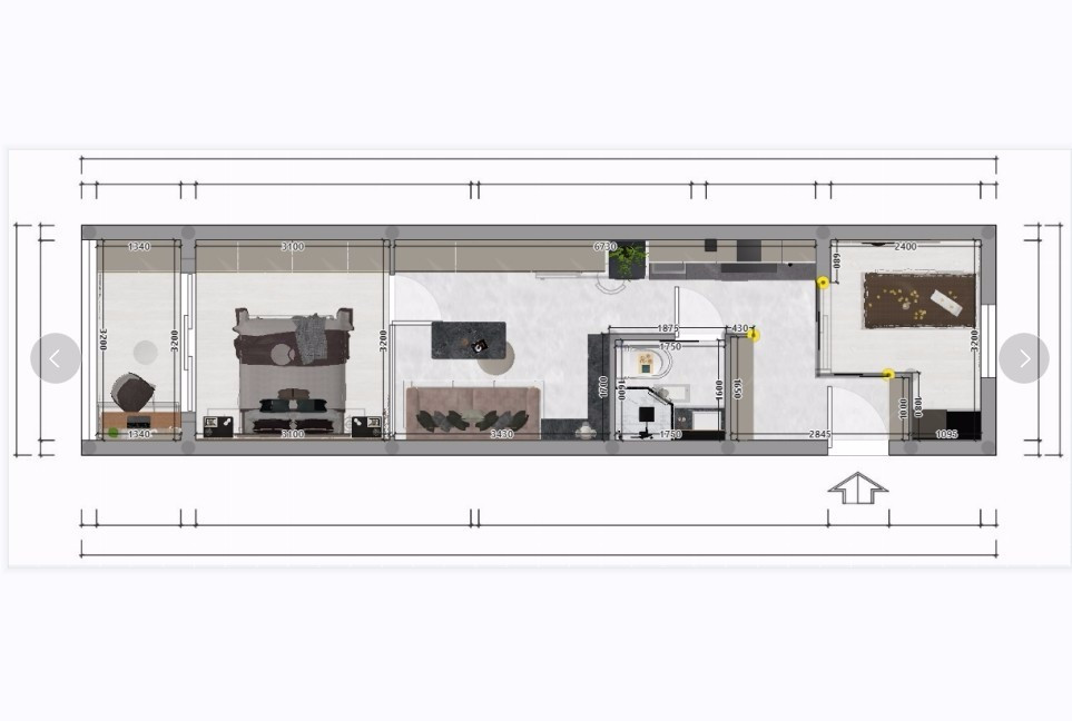 該戶型為常見的一字型戶型,格局方正,缺陷在于中間的區(qū)域采光較差,該設計剛好解決了這一缺點