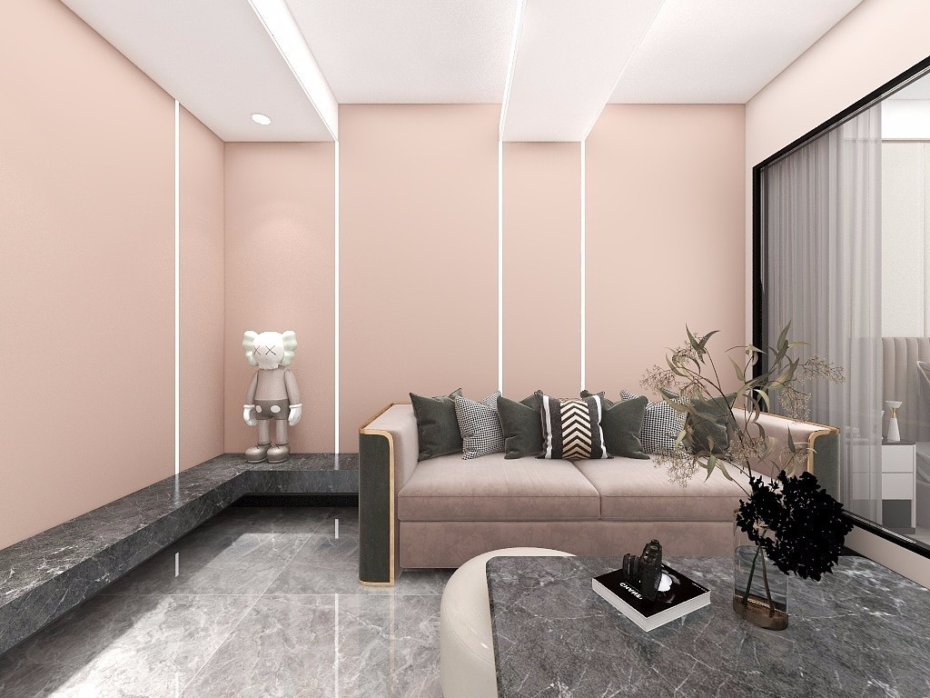 業(yè)主為單身女性,粉色與黑灰色的撞色完美契合業(yè)主的喜好,客廳與臥室之間采用了挖空采用玻璃設計,完美解決客廳光線問題