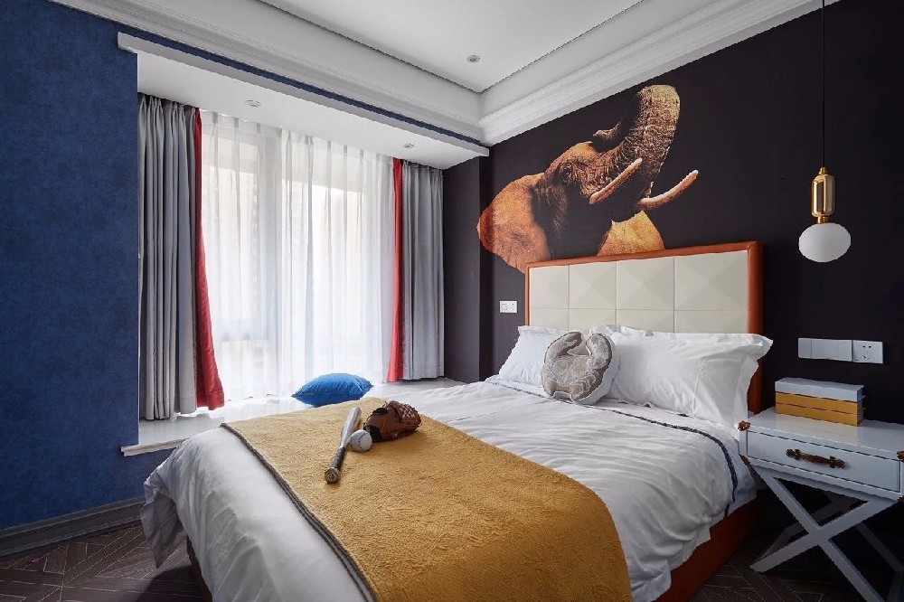 臥室床頭背景用黑色的布畫,整個色調也顯得很穩重。