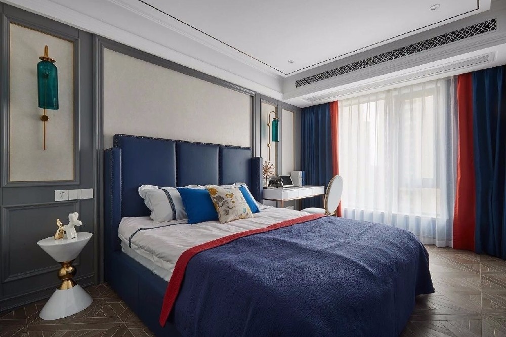 另外一個臥室采用護墻板結合,深色的皮質床,空間很整體。