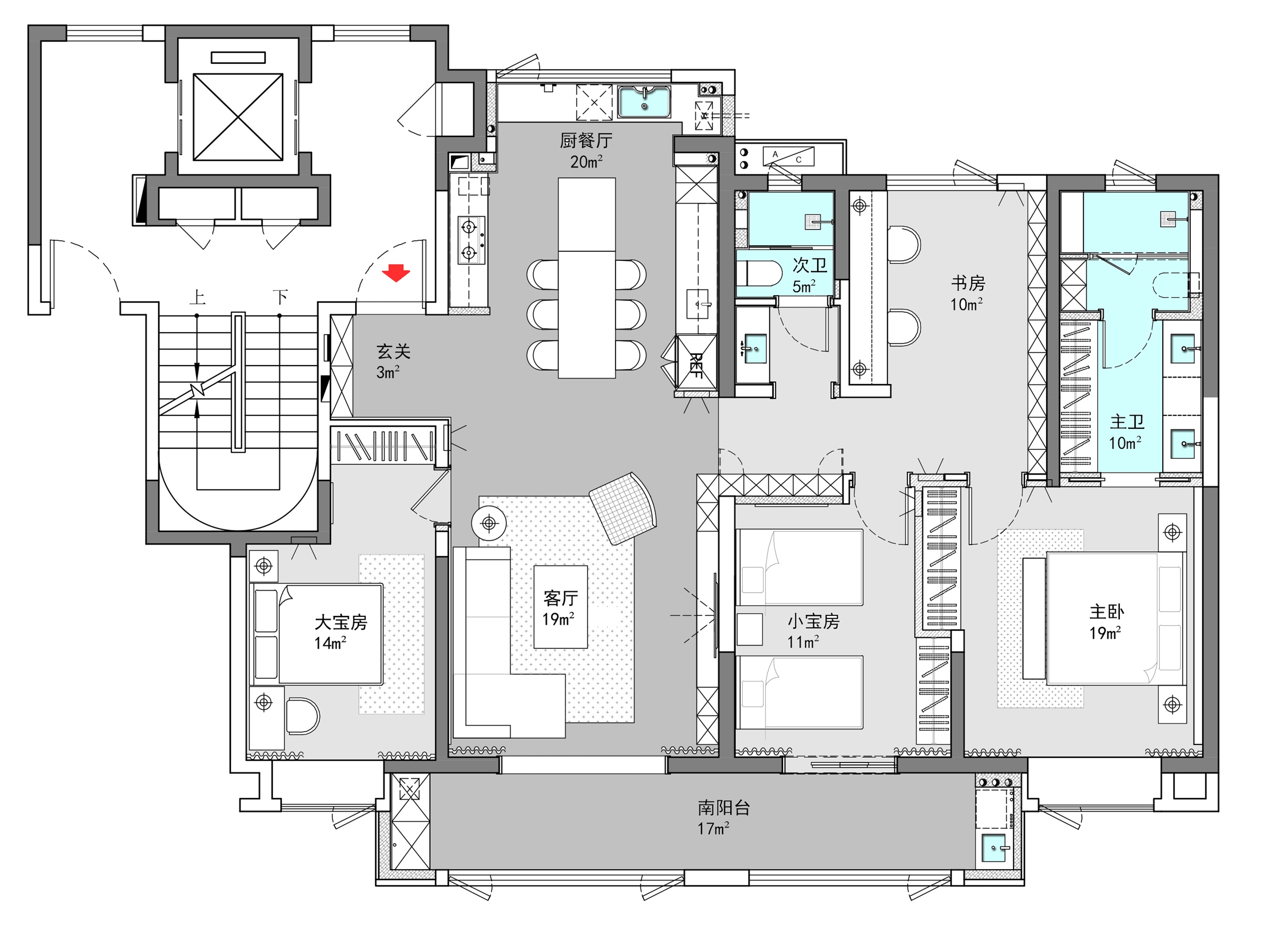 保證孩子活動的時候有足夠的空間。主要的活動空間包含客廳、餐廳、書房、廚房、南陽臺。